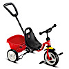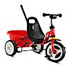 この三輪車はベビーカーとしても、また、三輪車としても使える便利な乗り物です。ペダルが空回りして足が絡まない安全なモードにすることができます。(方向転換やバックさせるときはガイドハンドルバーを下げ前輪を浮かして操作してください。)