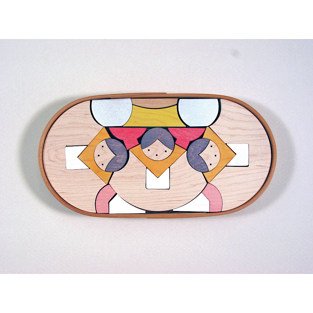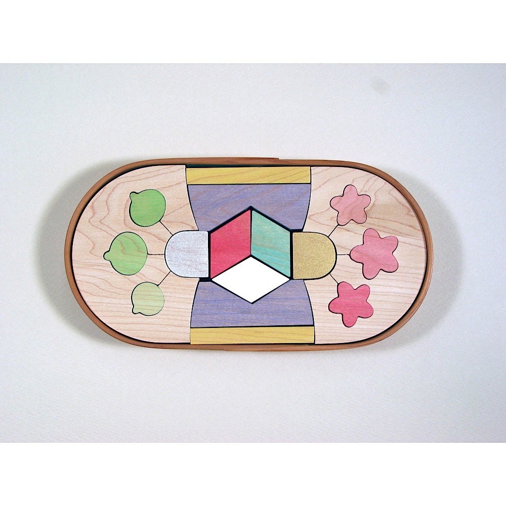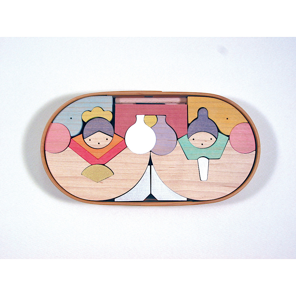 円を二つ接し、その上下を二本の水平線でつないで生まれるトラック型の曲げわっぱにお雛さまを収める段飾りです。